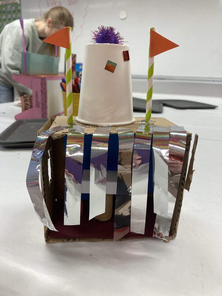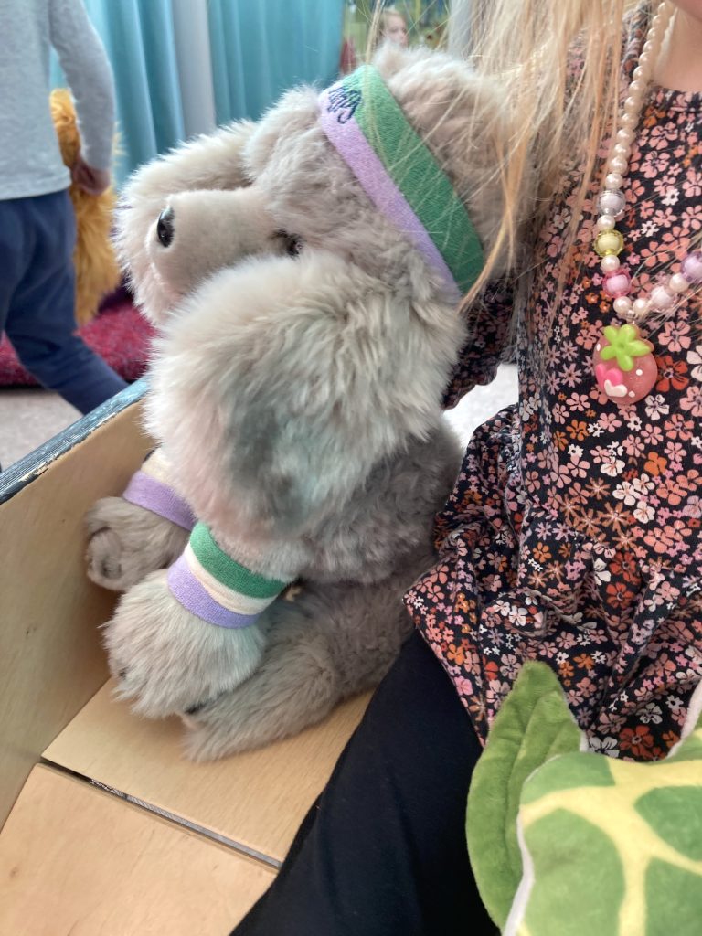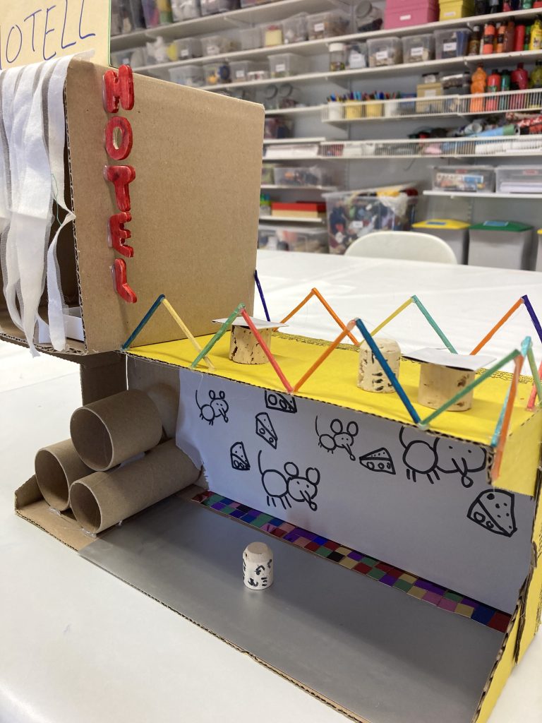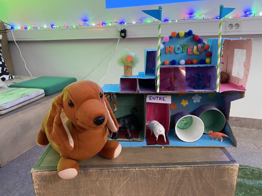I studion skapade vi sedan egna fantasifulla hotell. Hur ser ditt hotell ut? Vilka bor på ditt hotell? Kanske ett djungelhotell, katthotell, pokémonhotell eller djuren på gården hotell? Det skapades för fullt! Ett barn gjorde till och med en ritning över sitt hotell där tidigare figurer från Ordkarusellen hade checkat in. Det gjorde oss väldigt glada att se att Bulqash hade checkat in! Det är en figur från en bilderbok som vi har läst och dramatiserat för barnen långt tidigare och som stannat kvar i minnet hos just det här barnet.