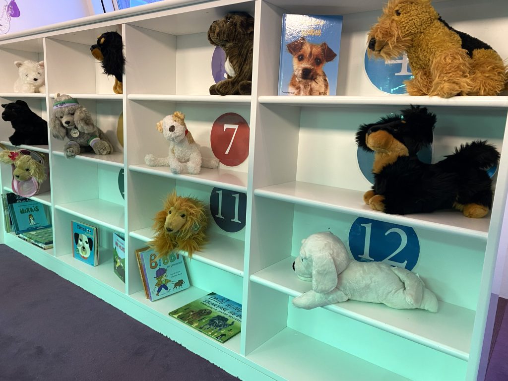 I några av de tomma hyllplanen fyllde vi på med hundprylar som en matskål, ett tuggben och en pipande leksak. Här går det att fylla på med fler saker som passar till en hund som t.ex. borste, tandborste, hundtröja, rosetter, halsband och koppel. För att locka till läsning har vi också placerat ut bilderböcker och faktaböcker om hundar.