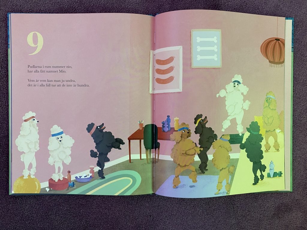 Bilderboken Hundhotellet av Jenny Sjödin är en räkne-bok som vi genast fastnade för! Handlingen är enkel och handlar om hunden Vira som håller ordning och reda på sitt fina hundhotell med tio rum. Hundhotellet är fullbokat och det är små och stora hundar som har checkat in i de olika rummen. För den som är intresserad av hundar är det roligt att lära sig namnen på de olika hundraserna. Schäfrar, vinthundar, samojeder, dalmatiner, mopsar m.fl. är med i boken. Boken är också lätt att läsa med skojiga rim utifrån varje hotellrums siffra. Illustrationerna är tydliga med härliga färger och lagom mycket detaljer för den uppmärksamme. På varje uppslag kan läsaren räkna hur många hundar som finns i rummen och det gäller också att hitta rätt antal hundben.